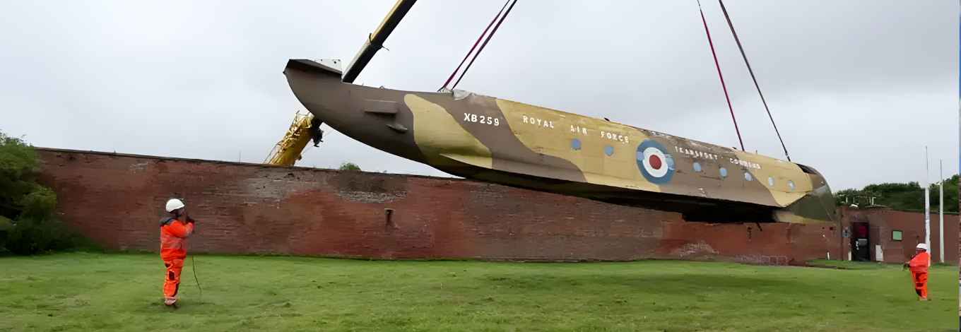 Sections of a huge RAF transport aeroplane have been lifted from a fort by crane ahead of its journey to a museum.